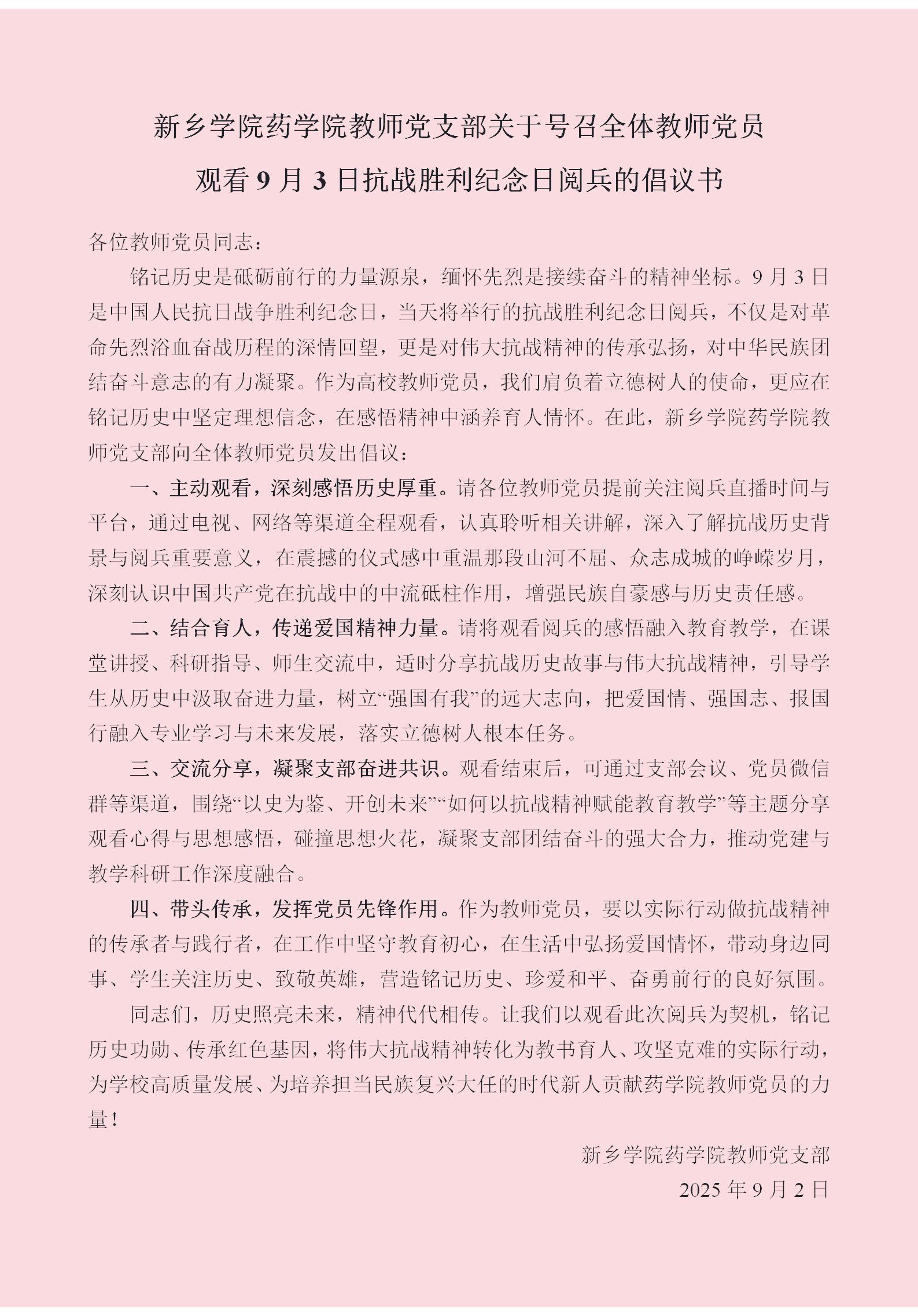 tyc122ccvip教师党支部书记丰贵鹏谈到:观看80年抗战胜利阅兵,心潮澎湃,感慨万千:大国重器,捍卫和平基石;铭记历史,缅怀先烈,吾辈当以育人之责,传承抗战精神,培育时代药学新人。