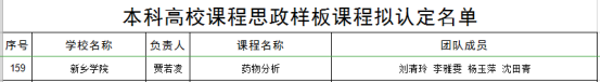 按照河南省教育厅《关于开展本科高校课程思政项目建设的通知》(教高〔2020〕426号)要求,经过公司申报、专家评审、结果公示等环节,公司共推选出4门课程参与本科高校课程思政评选,根据《河南省教育厅关于河南省本科高校课程思政项目建设评审结果公示的通知》,公司共认定4门课程,公司贾若凌老师主持的《药物分析》课程被认定为河南省首批本科高校课程思政项样板课程。