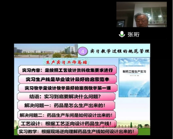 张珩教授以“制药生产实习中工程能力培养的研究”为主题,从生产实习课程意义与现状、生产实习教学的再思考、生产实习教学如何做、实习教学过程的规范管理四方面作了专题讲座。张教授指出,实习主要培养的就是要解决工程问题,并分别从课程的设置、课程内涵以及教学目标等几个方面分析了生产实习的基本情况。张教授以丰富的案例详细的说明了如何以产品引导和教师指导的途径实现产品、工艺、设备和生产线的有机结合。明确了生产实习教学过程要做到产品全流程、工艺全流程、设备全流程、绘图全流程的规范化管理。
